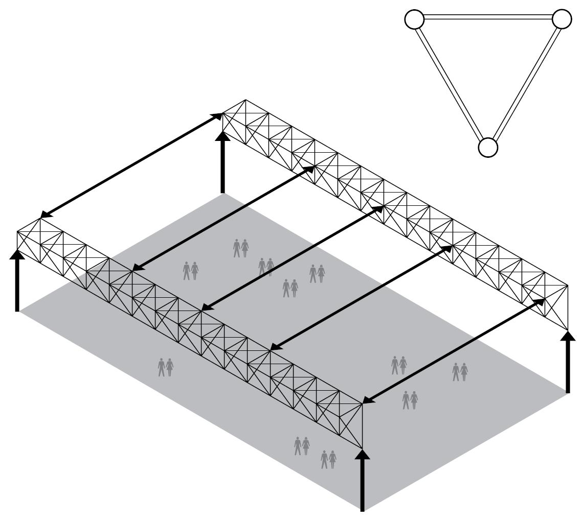 A SPACE FRAME is a one-way structure that can be visualized as two planar trusses meeting each other at the bottom chord with the top two chords being framed as a third truss. This three-dimensional truss can resist vertical, horizontal, as well as torsional forces. Bending moments and deflection can be effectively resisted by controlling the truss depth at critical points. SPACE TRUSSES can be used to span long distances with a wide array of roof profiles. The depth of space trusses fall in the range of span/5 to span/15, depending on the tributary load being carried and the magnitude of the deflection permitted for the long span. Loads from the secondary members should occur at panel joints to avoid inducing localized bending moments in the individual members. Typical module sizes 1220, 1525, 2440, 3660mm.