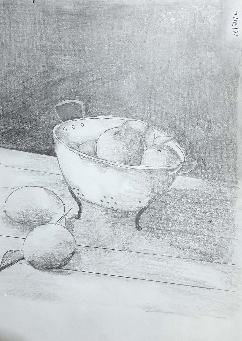 Aqui se puede apreciar uno de sus ilustraciones: Un bodegon, es la naturaleza muerta, la cual puede representar todo ser vivo y objetos. La tecnica que se utilizó fue a lapices y carboncillos en escala de grises , como mesa de trabajo se uso una bitacora A4. En su elaboracion se inspiro en otros bodegones, donde contenian cualquier especie de frutas o verduras, muy atractivas y preferidas para el espectador. Como elemento infaltable en su distribucion de elementos se usa una mesa y una cesta para darle mas profundidad