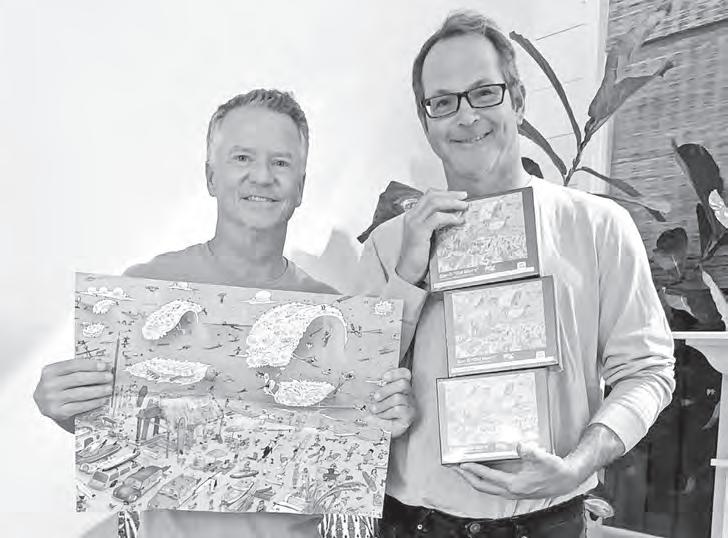 “But the puzzle is—it’s kind of weird, because I can’t explain why there’s a cowboy in a Speedo playing horseshoes with his horse on the sand, and why there’s a chicken there, and there’s a guy in an inner tube there,” Snibbe continued, explaining how the ideas for his art come to him.” It’s just stuff that pops into my head, and I’m off to the races with my pencil.”