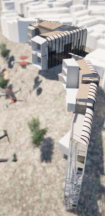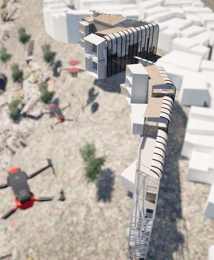 We attempted to do this by creating frames into the landscape from the street, as well as creating other frames from some of the internal spaces. Both for the aesthetic aspect of the design aswell as the practical aspect where these frames would act as harbours for the AI drones