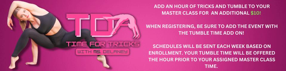 "TDA Time For Tricks" will be offered alongside our Master Class Series Program listed below. All Tumble Time Classes will line up before your scheduled Master Class, and is an additional $10 fee. You have to take the Master Class in order to Add On Acro. We are so excited to have Ms Delaney, who is ready to get working hard with these dancers!