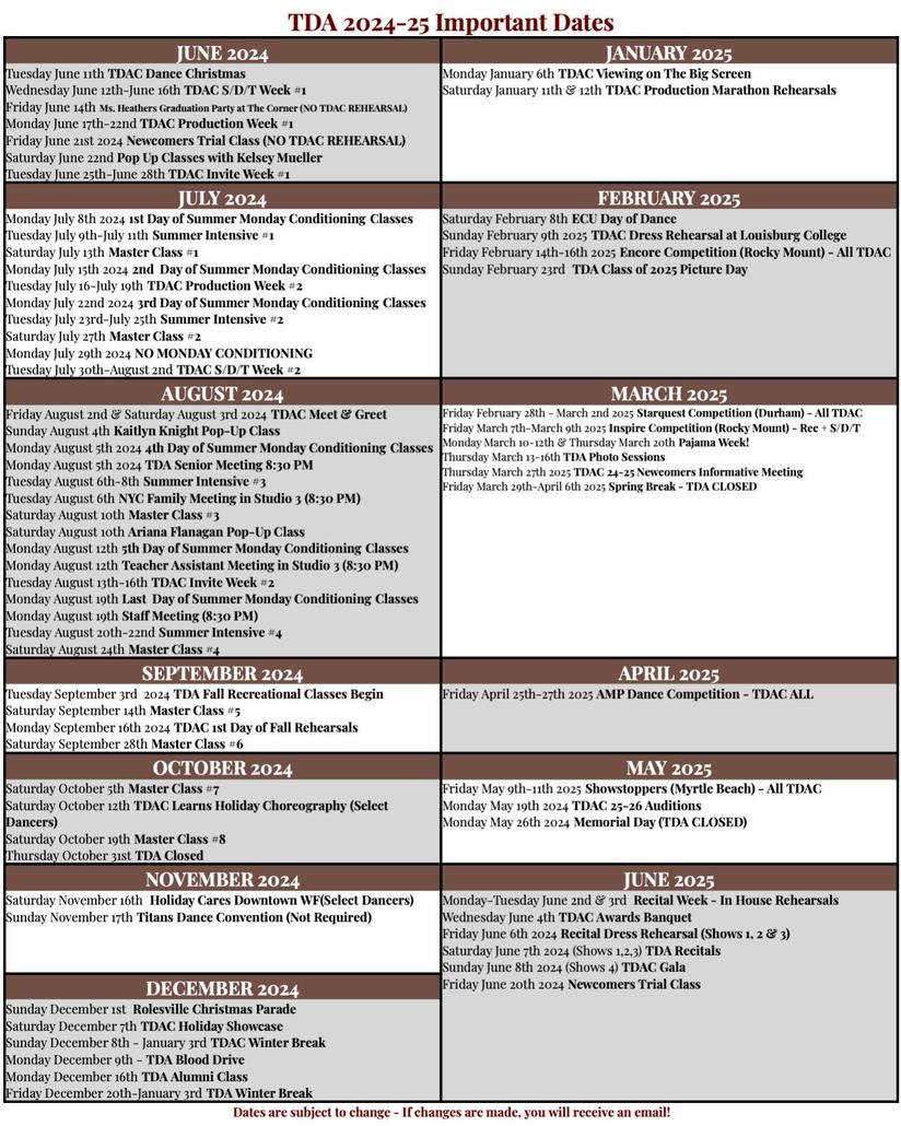 A huge shout out to all of our families and dancers who helped close out a fabulous year with a memorable recital TDA has enjoyed some rest and relaxation, and is ready to move forward as we start our 37th season and are “Dancing With The Trends! In our 37th Season, our theme is all about what's trending as all of our dancers are such icons and we are ready to boost their confidence as we dance our way through the season! From Monday Conditioning, Summer Intensives, and Master Classes, TDA Staff is so excited to see all of our dancers back in the studio, as well as all of our new faces joining us for the summer and fall dance seasons!
