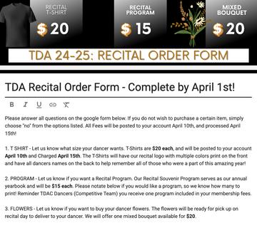 For recital, we have a couple of traditional merchandise and memoirs available for purchase. Click the link to the right to claim your Recital T-Shirts, Flowers, and Programs by APRIL 5th!