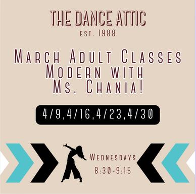 For the month of April we will have Ms. Chania for Modern! We hope to see you there! Right now we have 4 adults registered for the class and we will need a total of 8 to continue with the class!