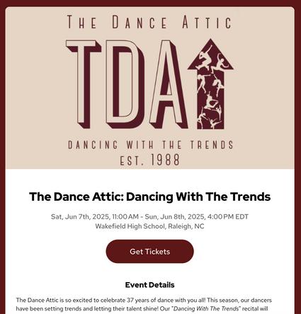 Step 6: You will receive a confirmation email soon after your transaction is complete with your ticket QR Code. You will present your tickets to the TDA Ticket Staff at Recital.