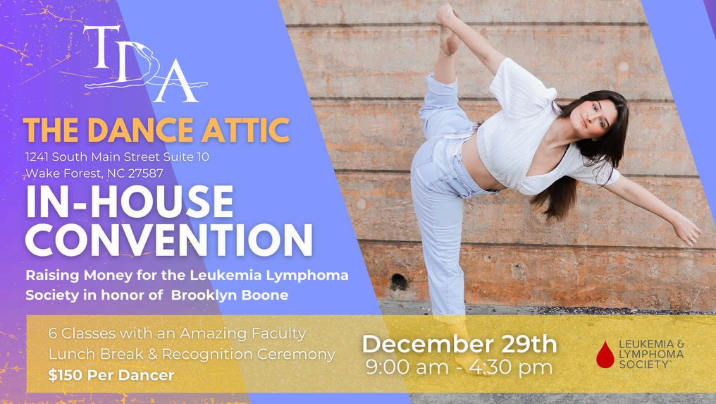 We are thrilled to announce an exciting new event at The Dance Attic an In-House Charity Convention! Mark your calendars for December 29th from 9:00 AM to 4:00 PM and get ready for an incredible day of dance and learning. All proceeds/profit from the event will go to support the Leukemia Lymphoma Society in honor of Brooklyn Boone, in connection with the work we’ve done with Maddie Austin and the Bolt for Brooklyn events in the past. The cost is $150 per dancer, and we must have at least 15 dancers registered to move forward. At this time, registration is only open to TDA Dancers, but we do plan on opening this event to other studios and the public, so feel free to invite your friends to join us for a great cause. This is not in any way required, but we hope to have great representation from TDA. Would be a great Holiday gift for a dancer if you ask me! We look forward to the potential bonding experience for dancers throughout the community.
