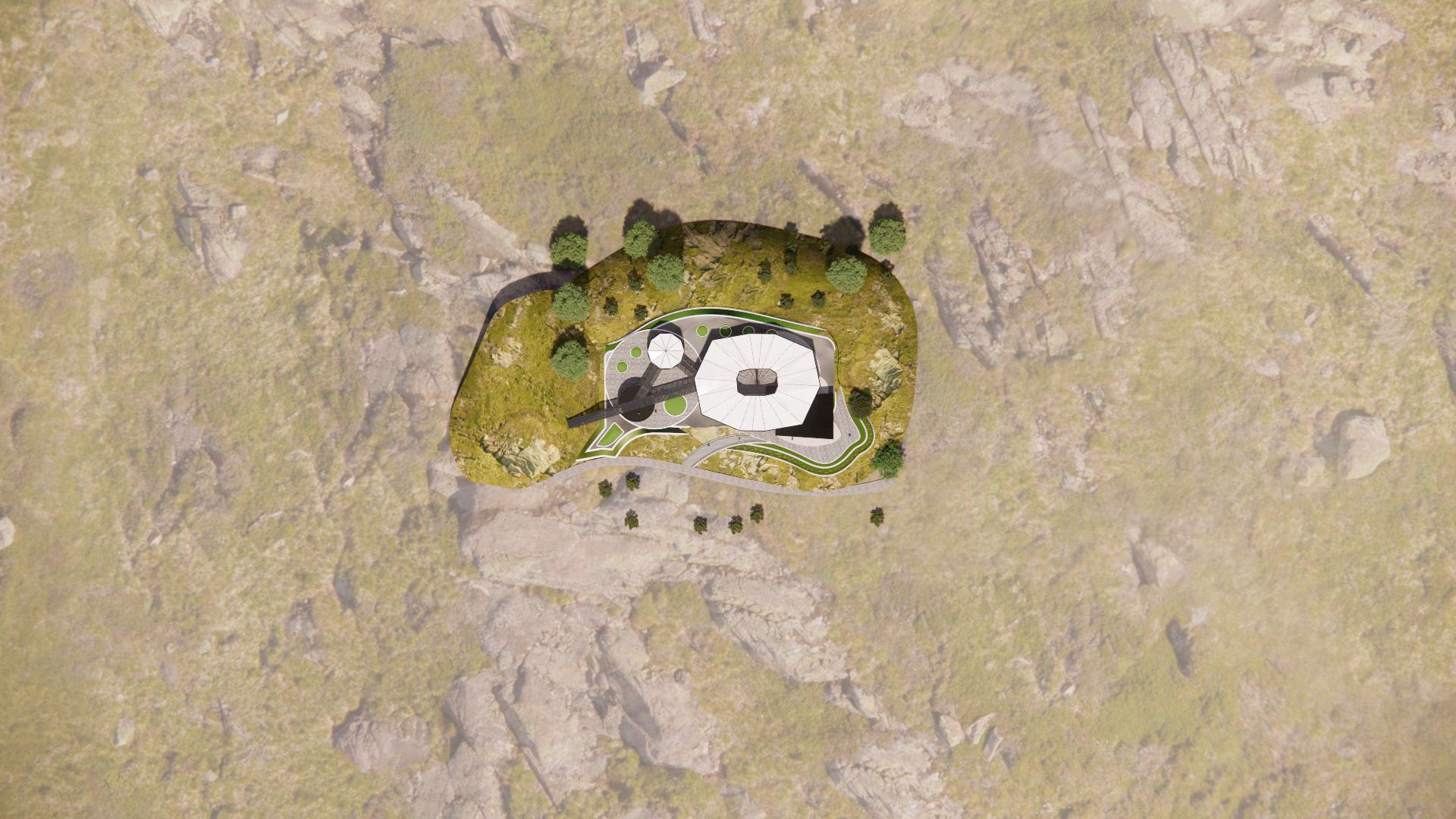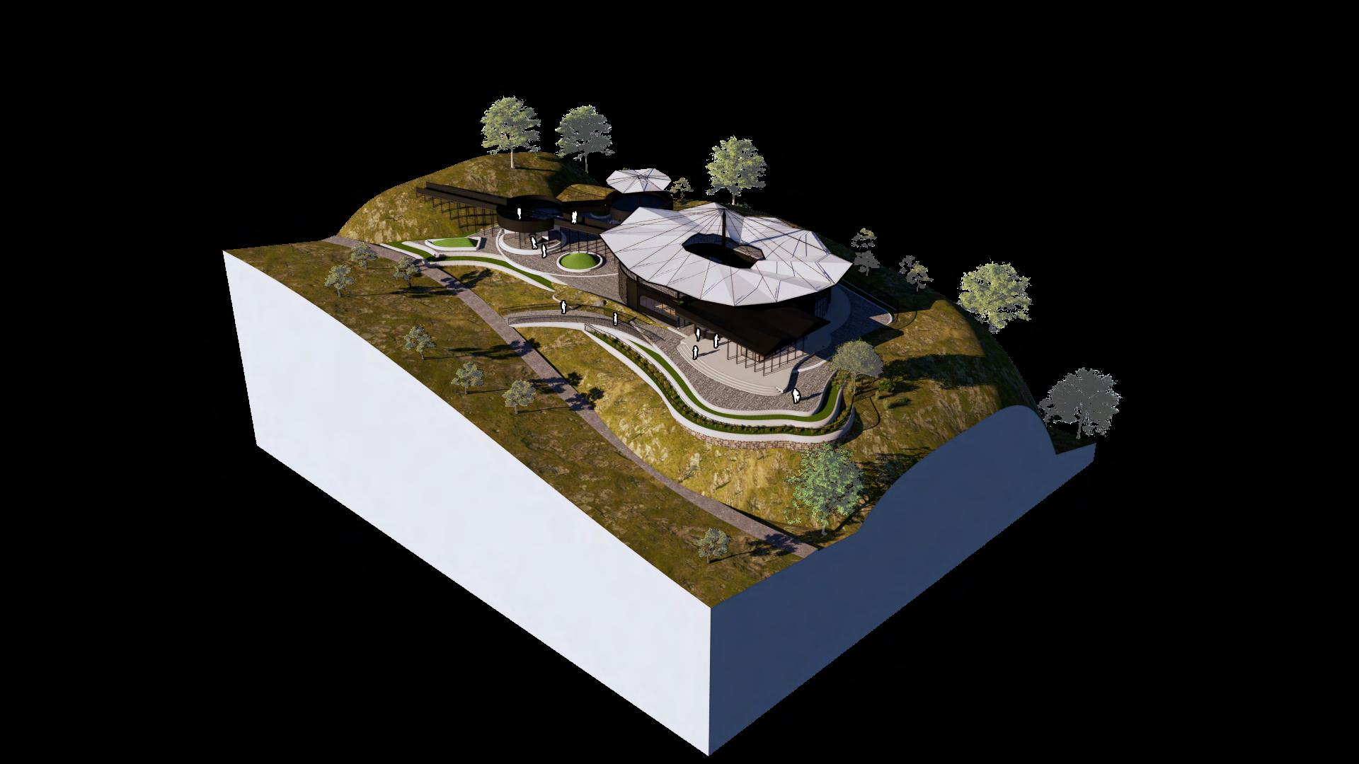 The design is formed by multi-mass geometry as analogy for sprawling stone at stone garden. About space organization, there’s a strong mass as prime area for visitors. Then, another mass become supporting unit with providing specific function such as viewing deck and outdoor exhibition.