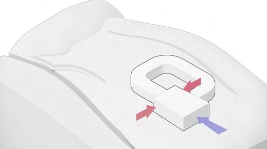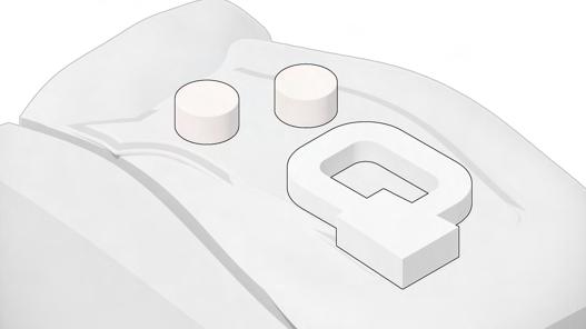 flat box as initial form fillet edge on four corner, forming rounded box and adding inner court due to substraction adding two identic cylindrical mass as supporting mass connect all with intersecting liniear mass resulting datum and cutting the top of mass to create sharp rock-like roof articulating the previous mass to be more void and detail