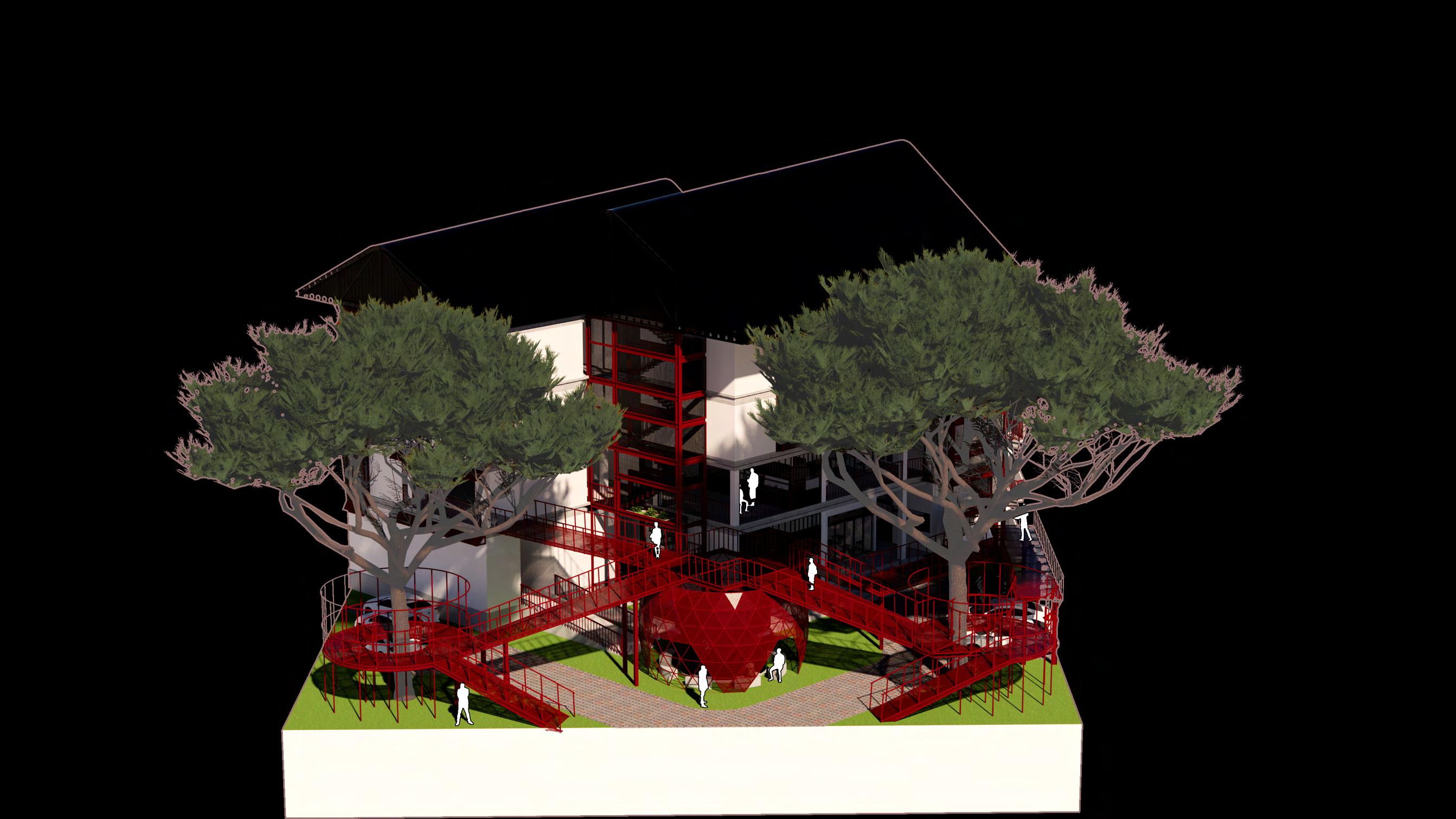 The exhibition area serves as the second part of art therapy. The building's mass is distinguished by transparent walls and exposed structures. It was meant for exhibitions that could be accommodated. Long-term art display with light installations that are always accessible. The usage of wiremesh walls maximizes the use of display area that can be used as a hanging location. It is also consistent with the concept of a vertical garden.