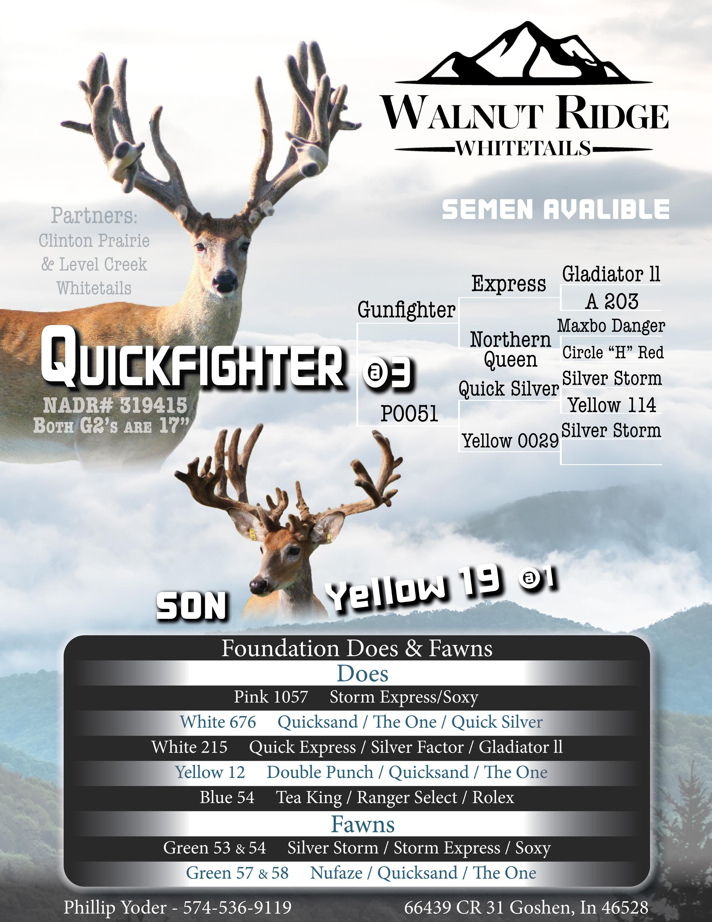 I think this pedigree speaks for itself! Live Covered by Quick Fighter. (See Ad). These fawns are bred for frame and tine length. Purple 51 is producing... S’s and negative GEBV #s!