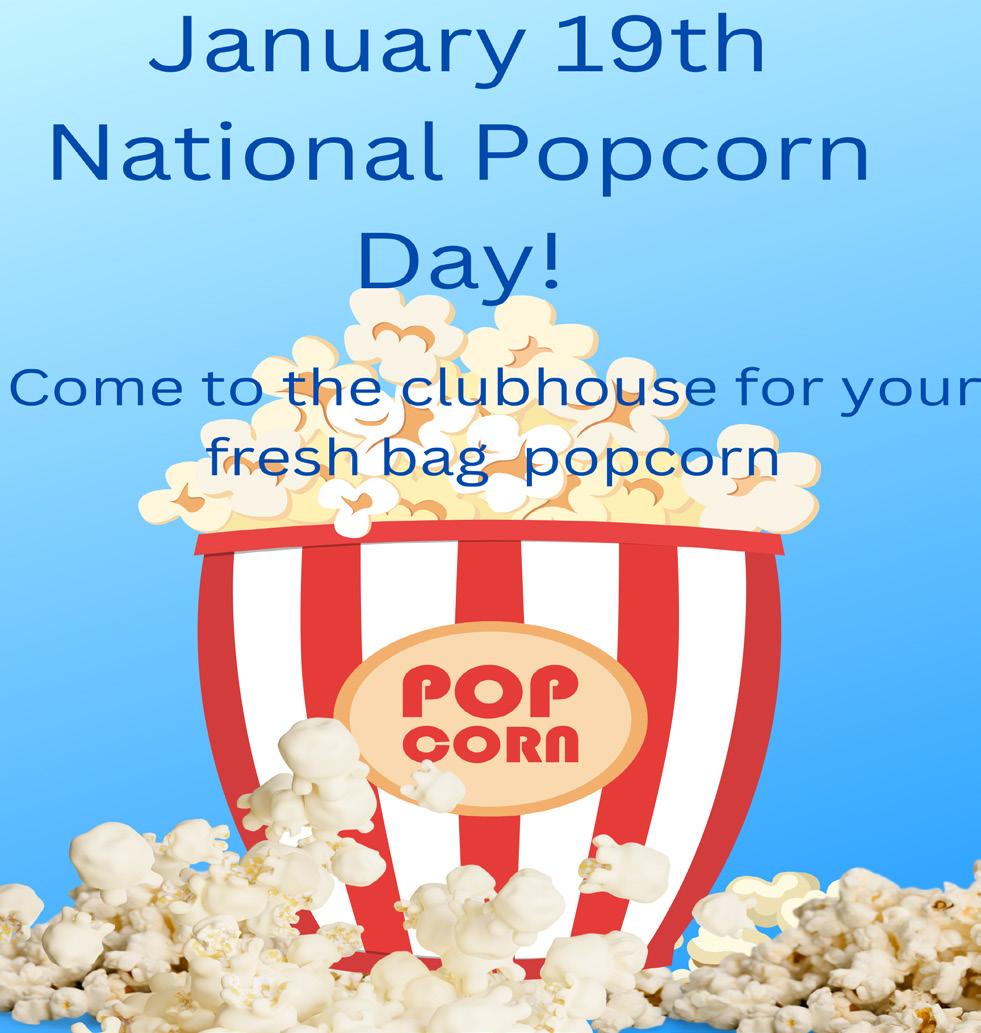 Join us on January 19, as we celebrate National Popcorn Day! Buttered, salted, kettled, drizzled with caramel, popcorn is one of those snacks perfect anytime, anywhere. It’s great on the go, in the theater, or in your living room! Just be prepared to dig some of it out of your teeth. Come to the clubhouse for the smell of freshly popped popcorn and grab a bag.