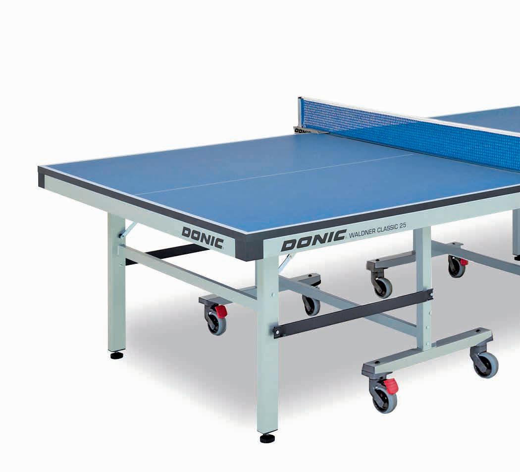 Plateau de compétition, 25 mm. Table classique sur pied. Piètement métallique stable, revêtu par poudre. Construction éprouvée et stable. Montage facile grâce à une ferrure pliante parfaite. 2 roulettes stables par moitié pour un transport confortable. Conforme à la norme EN 14468-1 A. Frais de transport inclus.