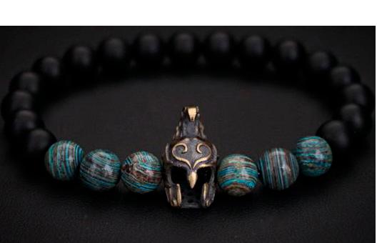 Brazalete compuesto por granadas hechas de roca natural ahumada, en colores negro y azul. Casco de Guerre Spartano en Acero, a solo: