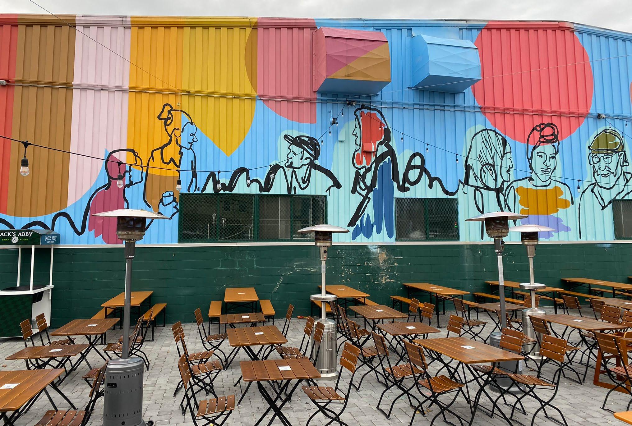 Roving in Framingham with Rachel to discover public art was the beginning of our first post for Beyond Our Walls. The side of Jack’s Abbey was the largest mural we saw. At over 300 feet long, it was a huge undertaking for artist Mia Cross; she used over 45 gallons of paint and 50 different colors! Big splashes of color, organic shapes, and patterns flow to the right and give way to a gathering of people to signify the sense of community that beer and the brewery bring to the neighborhood. I look forward to sitting outside, taking in the art and sipping when the weather is nice!