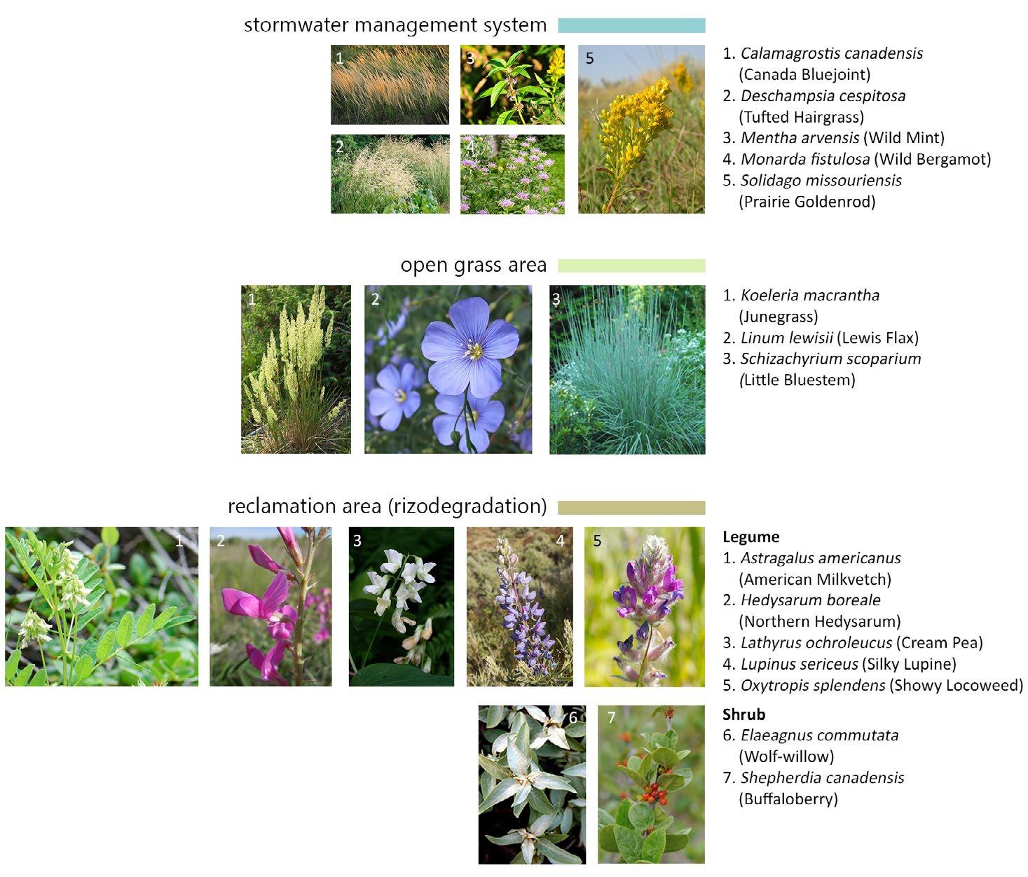 Grass Area: The open grass area which combines the native grass and wildflowers species of the prairies places that are intended as informal gathering or social spaces.