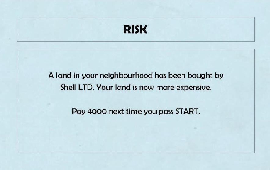 According to the space the character token reaches, the player may be entitled to buy landor obliged to pay rent, pay taxes, draw a Risk or Summit card, or fall down the ladder, where the player is taken back to a point on the edge of the board (near the starting point).