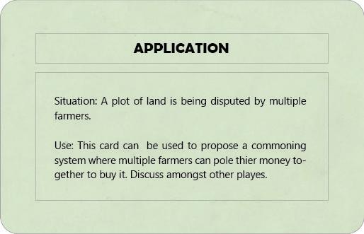 These cards are randomly distributed to the game players at the start of the game, helping them understand and empathise with ideas of commoning.