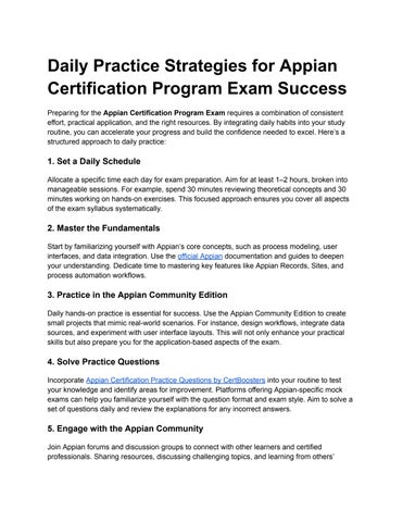 Preparing for the Appian Certification Program Exam requires a combination of consistent effort, practical application, and the right resources By integrating daily habits into your study routine, you can accelerate your progress and build the confidence needed to excel Here’s a structured approach to daily practice: