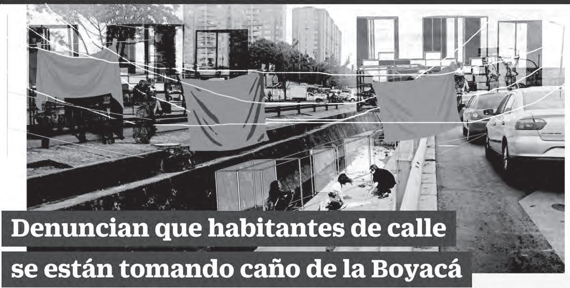 El primer esquema que se realizó para ilustrar las primeras ideas de ejecución del tendedero fue un collage. Este mostra ba como base la noticia de habitantes de la calle haciendo uso de un caño para sus necesidades humanos. Asimismo, se repre sentan dentro del collage algunas de las ilustraciones que se usaron en el 2021 por el colectivo EN-Tendedero. Siguiendo este hilo de ideas de como generar un tendede ro, se debatieron distintos estilos que generaban varias funciones. Algunas mas complejas y funcionales y unas más sim bólicas y conceptuales. Mediante el ejer cicio de escoger imágenes para proyectar todo lo que el proyecto discute, se abordaron las ultimas 2 opciones de inter vención. Ambas como forma de instalación artística con el poder de informar e interrumpir el paisaje existente para los estudiantes y demás personas que trascur ren por esa zona.