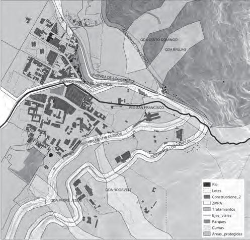 Dentro del mapeo realizado se identifica la zona entre el nacimiento del rio y el centro de Bogotá. Es espacio escogido pre senta unas dinámicas muy interesantes que implica el alto movimiento comercial y labor alrededor del eje ambiental. Se garantizan unas interacciones de distintas dinámicas sociales que interceden con el agua, de forma directa e indirecta. Se pueden identificar dentro de cierto recor rido del rio, puntos que han sido domina dos más por la comunidad universitaria pero a medida que baja el rio en dirección sur, este dinamismo se empieza a perder.