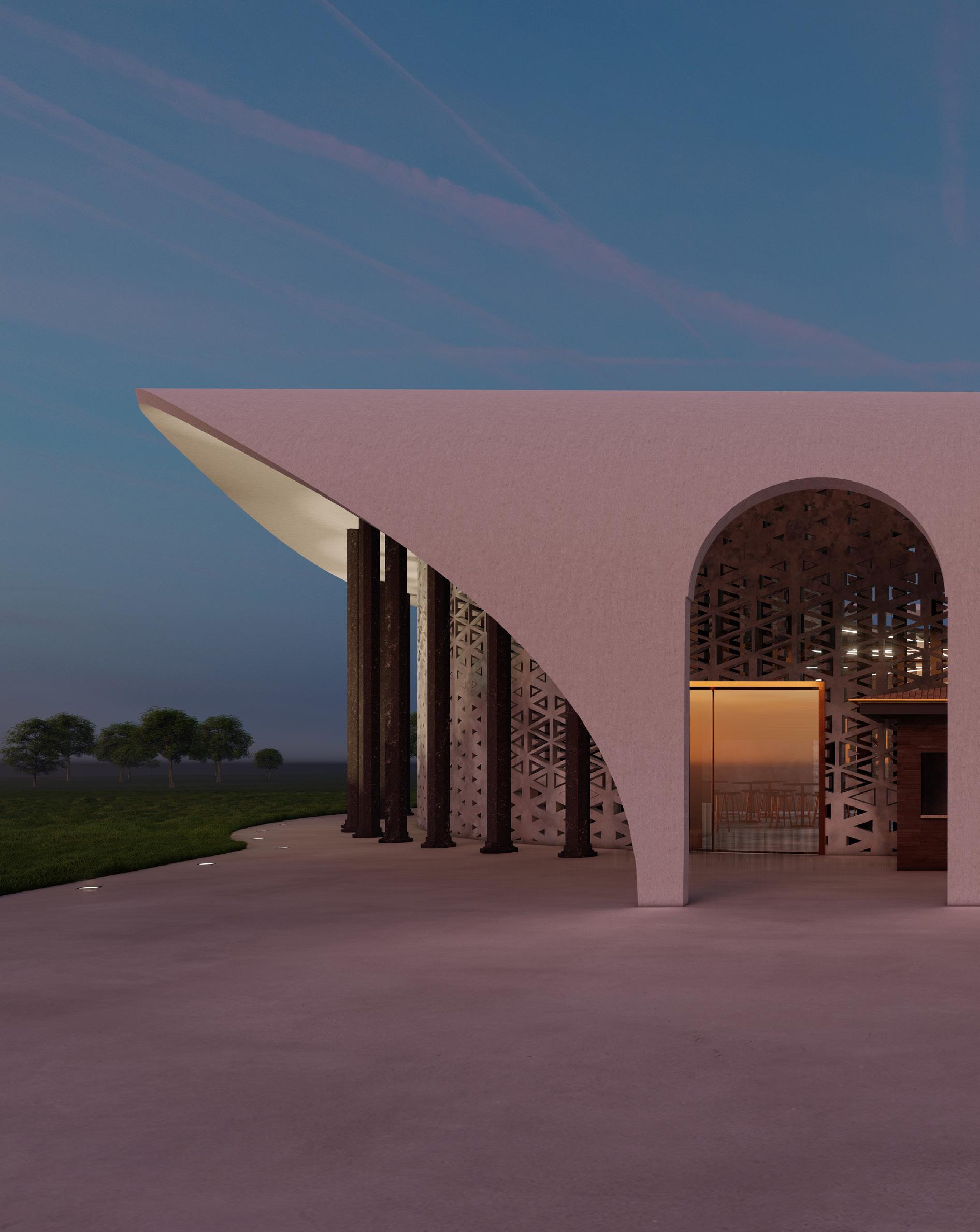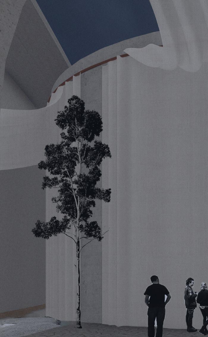 Curtains greet guests with their ephemeral presence. Their winding throughout the site allows to facilitate movement and guide users through to the different public spaces