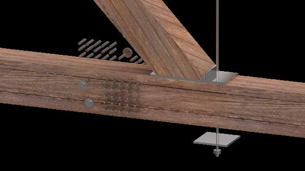 Detail Render of joists supported by steel rope with capped fasteners and steel fixings, also conjoined by a system of nails and joints