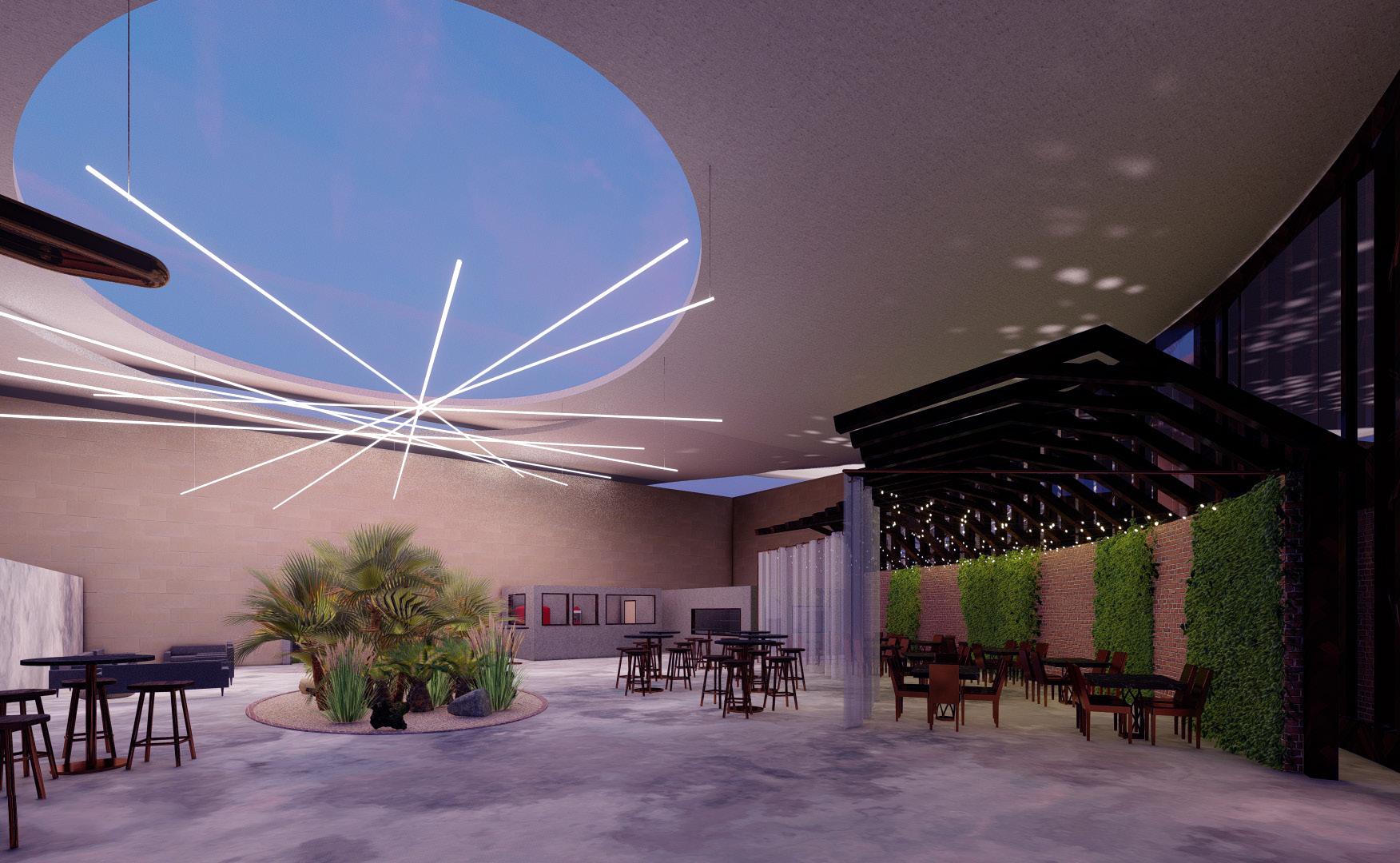 The “small theatre” housing a 100-person audience, features a black box performance space inclusive of backstage areas, back of house open floor plan, transition to light spaces, and a large foyer area inclusive of a restaurant, bar, concession stand, entry ticket-booth and restroom facilities.