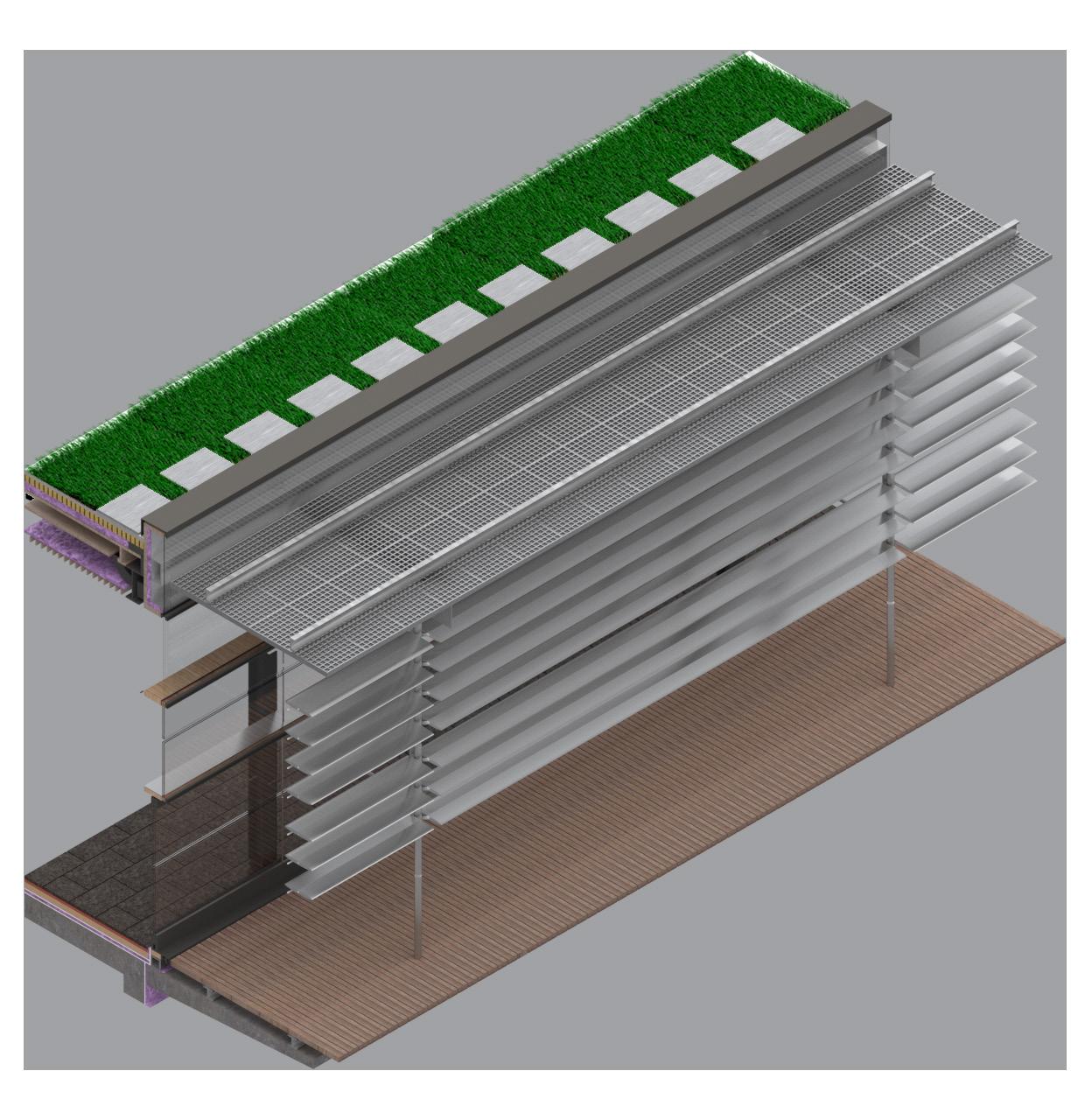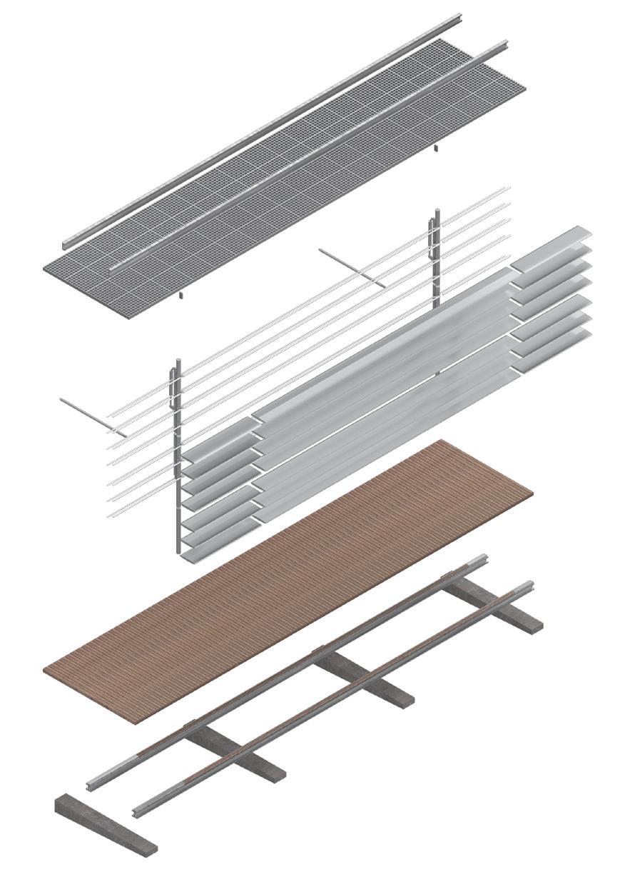 Steel facade framing connected by 32 mm diameter poles attatched to mechanically operated aluminium louvres along building balcony patio
