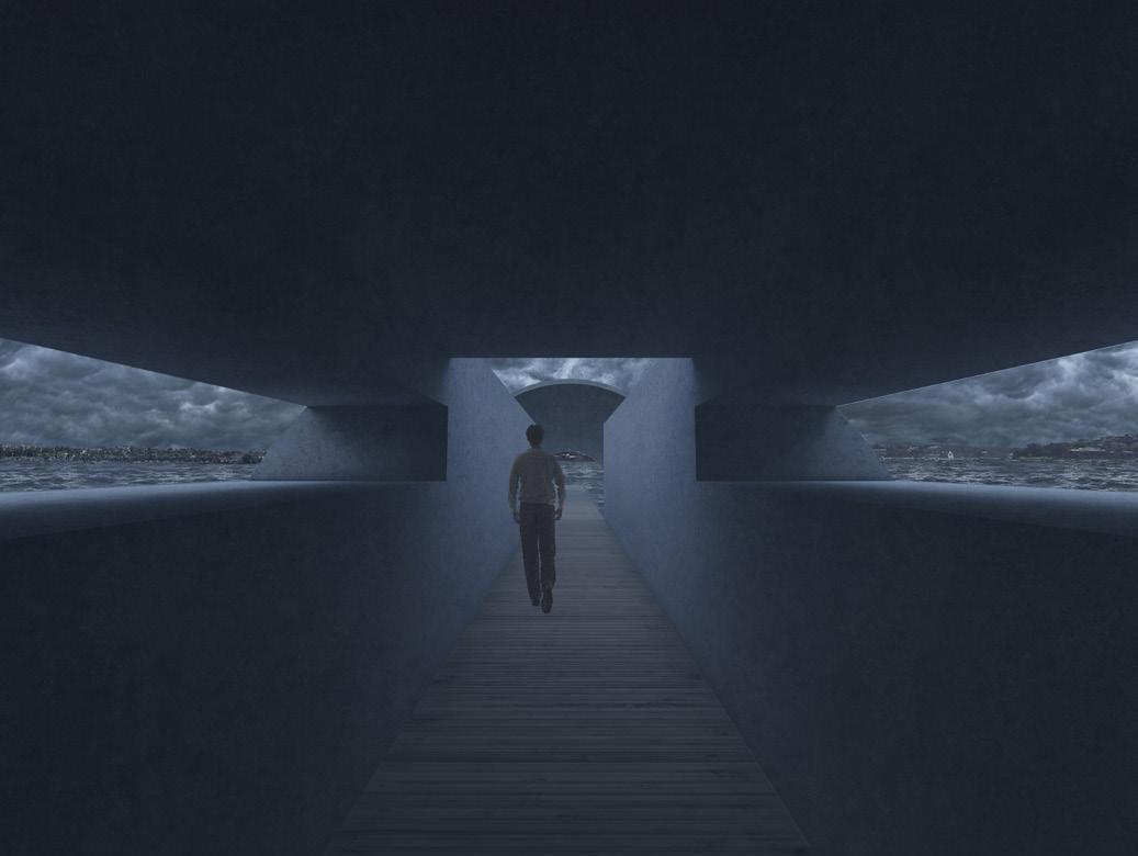 Visitors are guided along the illuminated concrete admissions booth through which they will be afforded