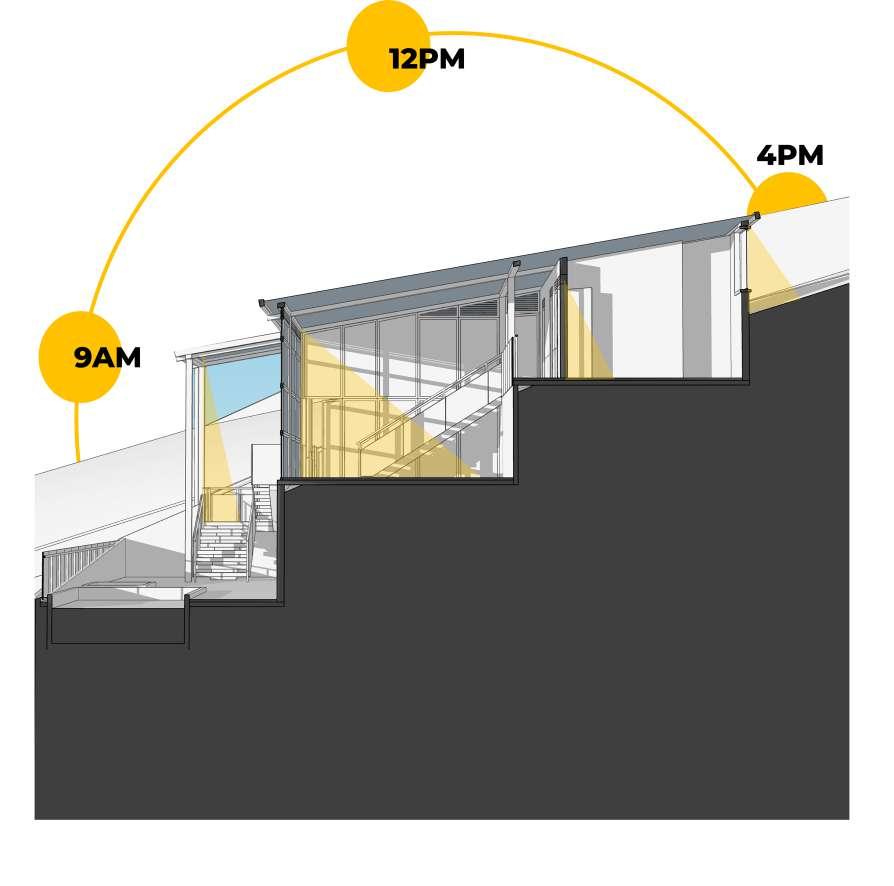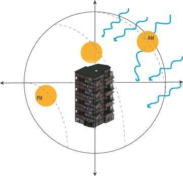 The sun in the morning hits the frontal facade, while in the middle of the day hits the roofs, and finally in the afternoon the sun hits the posterior facade.