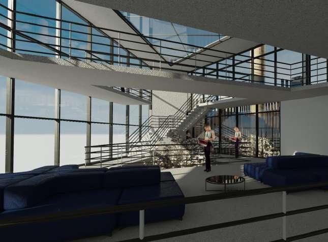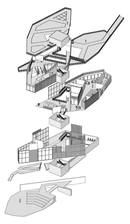 The building is devided in five levels, starting to count from the access plaza (floor -1). In the first floor we have a comercial area that is accesible for everyone, however in the second flor there are areas for authorized personnel only (research center), but also an area of public space; on the third floor the main use is the observatory, and finally we have a transitable roof that has some green areas and some water bodies.