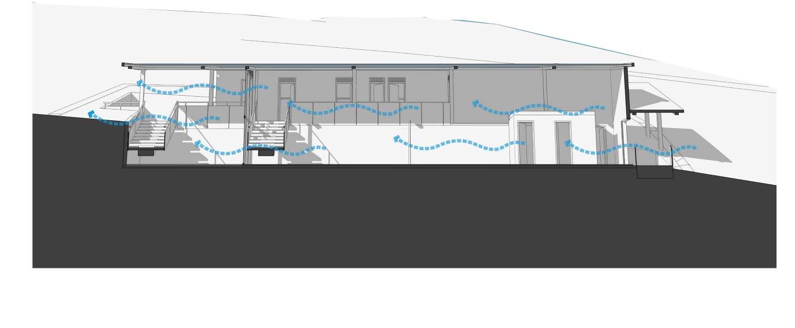 The most predominant winds have a west direction. Thanks to the glass facade and the amounts of windows in the project there is posible a cross ventilation, that allows a comfortable temperature int the project.