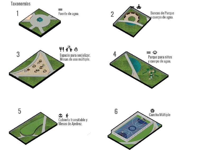 Collage 1 Collage 3 Collage 2For the park in the project we designed six taxonomies in total, that are distributed throughout the property limits. They are thought to make the viewer experience a variety of spaces, while at the same time made to meet the possible needs of the inhabitants.