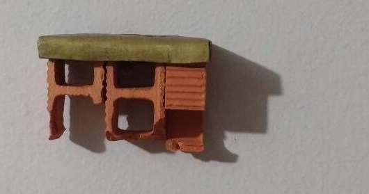 Escultura en técnica mixta: cemento, arena, ladrillos miniatura, madera, tela, acetato y pintura acrílica