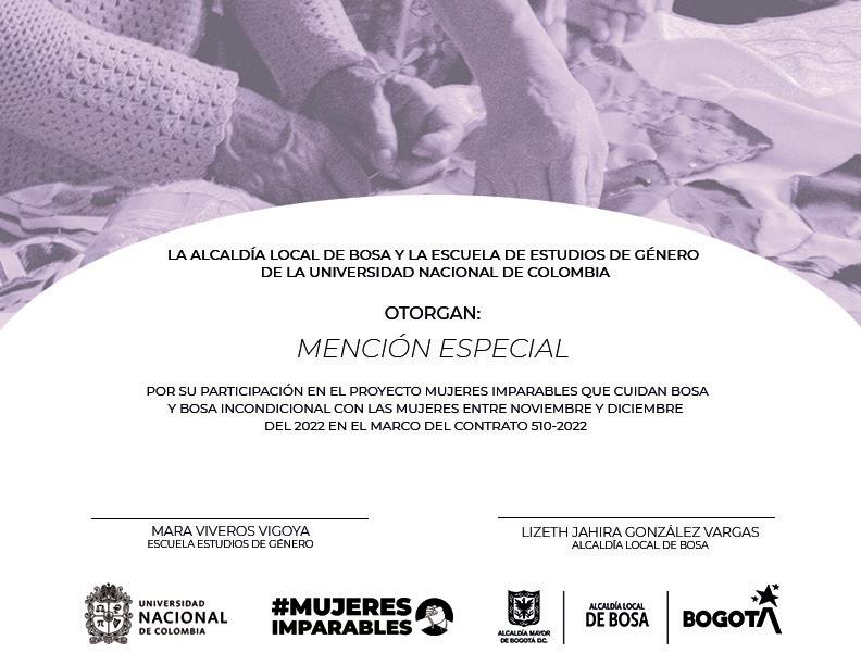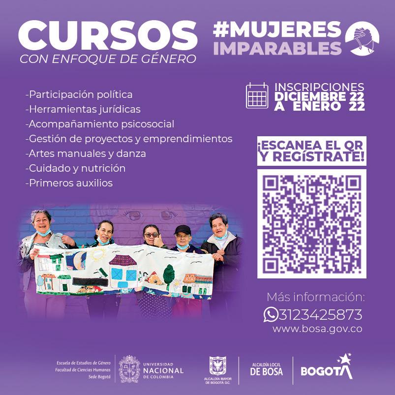 Profesional de comunicaciones para el proyecto Mujeres Imparables de Bosa creado por la Alcaldía Local de Bosa y ejectuado por la Escuela de Estudios de Género Unal, un proyecto que consiste en la realización de cursos de formación en diversas áreas para mujeres, especialmente aquellas que se dedican a cuidar de otras personas. .