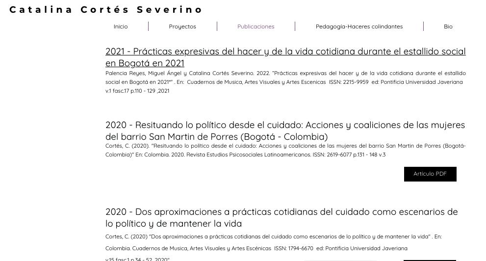 Diseño de página web profesional de la artista y profesora asociada Catalina Cortés Severino. Ella quería alguien que comprendiera su trabajo y temáticas, por ello realicé la sistematización de información sobre artículos académicos, proyectos de investigación colectivos, publicaciones y procesos pedagógicos para diseñar su página cuidando cada detalle.