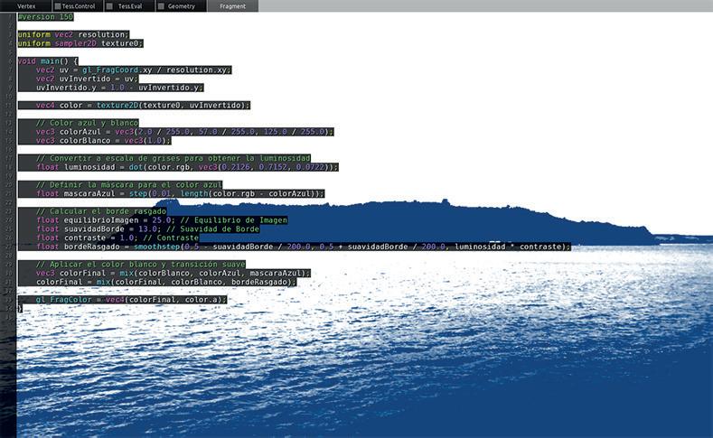 Para obtener un resultado visual similar al de la maqueta en Photoshop, se desarrollan ejercicios de escritura de código enfocados en la edición en tiempo real de una única imagen en Kodelife Open GL. En esta fase, se realizan modificaciones simples sobre una variable uniform sampler2D, como la variación de color a escala de grises, control de brillo y alto contraste. Luego, se avanza hacia una combinación de variables que logran el efecto Bordes rasgados de la maqueta. El código final genera un borde irregular en la imagen de entrada, calculando la luminosidad de cada píxel para identificar zonas de alto contraste y áreas cercanas a un tono azul específico. Esta diferencia de color se usa para aplicar una transición progresiva entre el azul y el blanco, creando un degradado suave que mejora la fluidez de los bordes en comparación con un simple efecto de alto contraste.