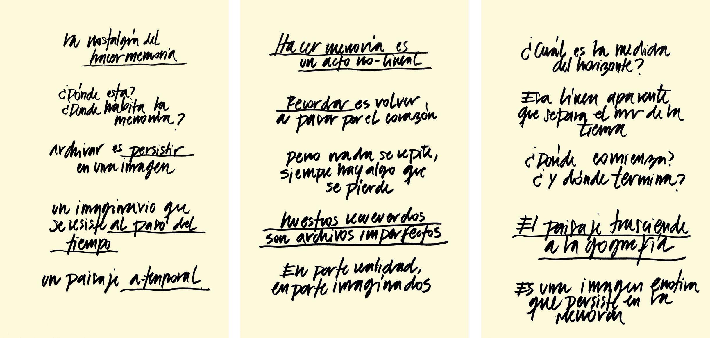 Desde el aspecto conceptual, el proyecto aborda el Paisaje afectivo como una forma de representación que trasciende al espacio físico-geográfico para convertirse en una construcción afectiva —quizás la experiencia más próxima a encarnar aquello que llamamos patrimonio. Al basarse en registros y memorias personales, la narrativa no lineal del proyecto crea un diálogo entre lo individual y lo colectivo, invitando al espectador a reconstruir su propio Paisaje afectivo a partir de sus vivencias y rasgos culturales.