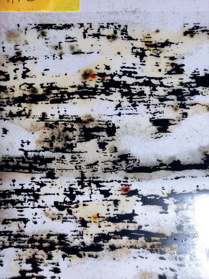 Detalle del proceso de cultivo de microorganismos recopilados mediante el frottage de las fachadas de la calle Catamarca sobre papel y emulsión de agar papa dextrosa. Estos cultivos finales conformaron el muestrario que integra la obra.