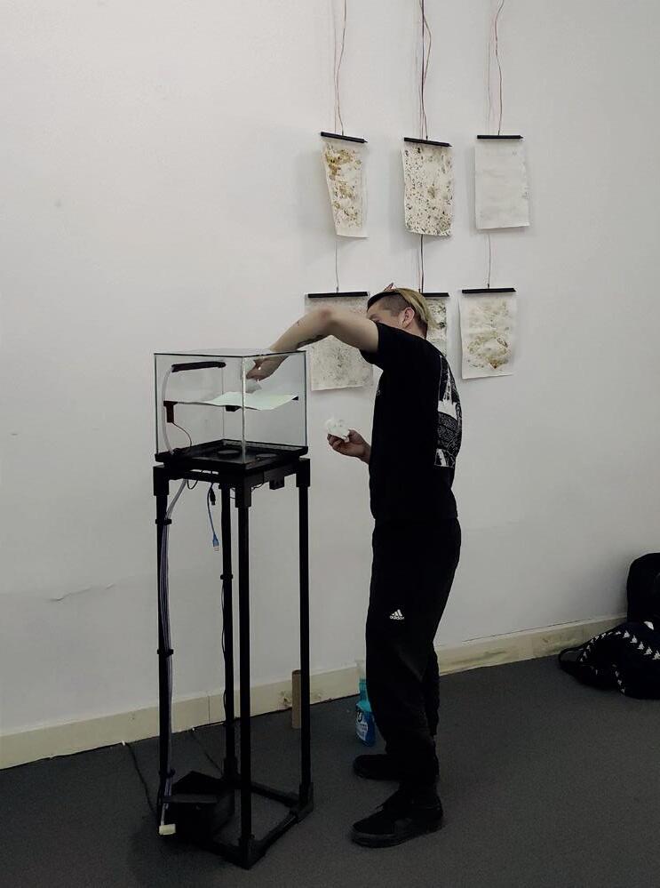 La bioinstalación se compone de un dispositivo denominado vitrinaincubadora, que permite el cultivo y exhibición de microorganismos en un ambiente controlado. La humedad se regula mediante una bomba de agua asociada a un sensor DHT-11, programado con Arduino, que la activa cuando detecta un nivel inferior al 70%. la temperatura es generada por una tira de luces LED ultravioleta, las cuales también contribuye a la evaporación del agua, generando un ambiente propicio para el crecimiento de los microorganismos sobre una hoja de papel suspendida dentro de la vitrina. La estructura está construida en vidrio con base plástica y un pedestal metálico, cuya base recoge el agua impulsada por la bomba.