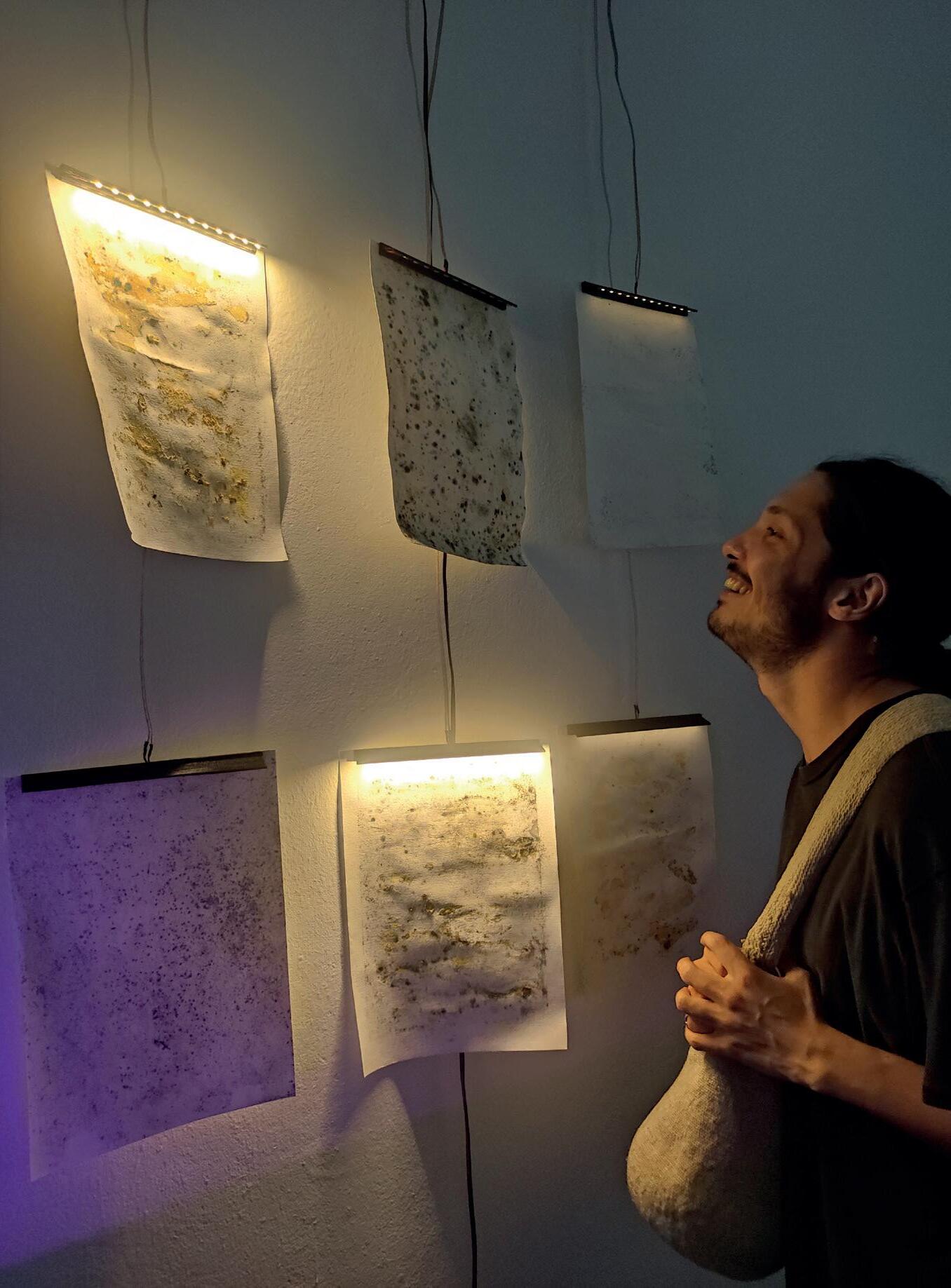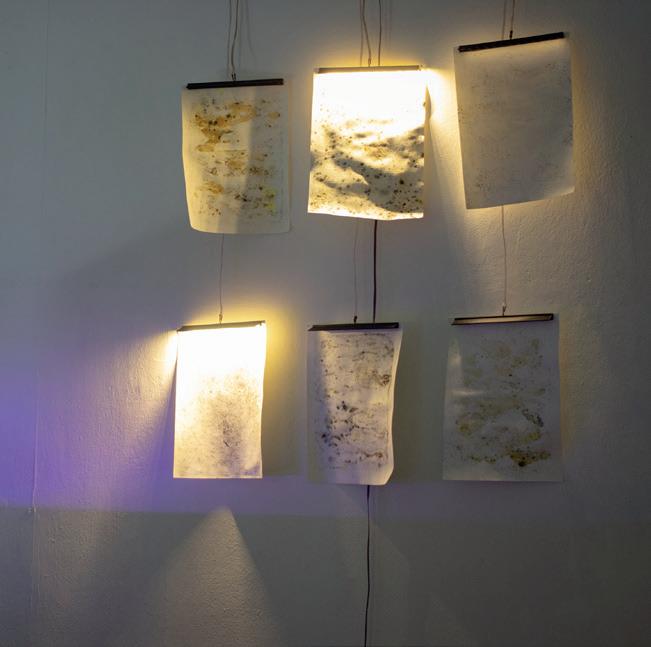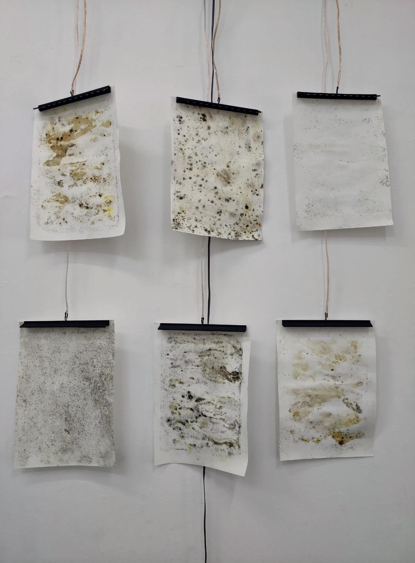 En paralelo, se exhiben seis cultivos de microorganismos realizados previamente sobre papel libre de ácido de alto gramaje. La técnica de “frotage” se realizó manualmente, utilizando una esponja para capturar microorganismos presentes en fachadas de viviendas en ruina de la calle Catamarca, en el barrio San Cristóbal. Las zonas seleccionadas contienen evidencias de crecimiento microbiano, garantizando la recolección sin contacto con el suelo. Los cultivos fueron luego emulsionados con agar de papadextrosa, que actúa como sustrato. Tras un período de incubación de 10 días, emergen patrones gráficos orgánicos que reflejan las particularidades de cada fachada.