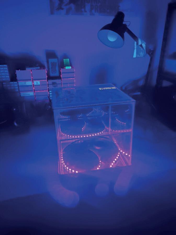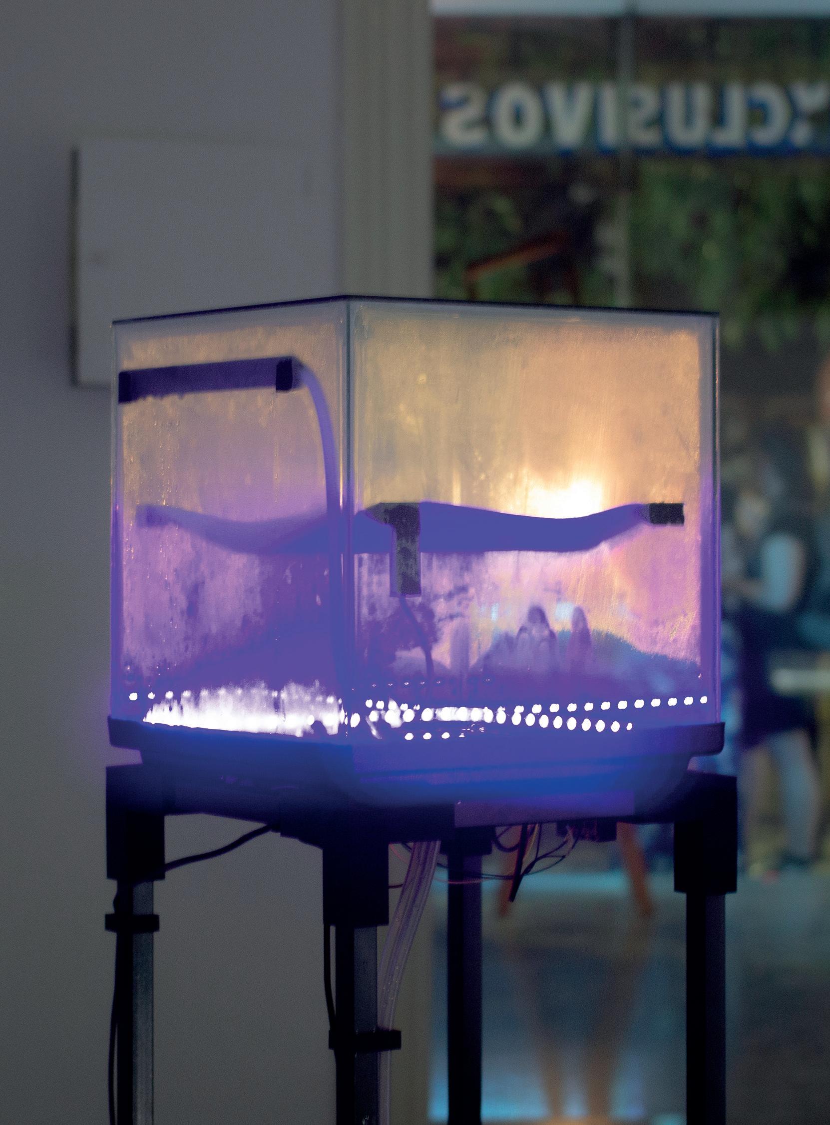 Se diseñó una versión preliminar del montaje de la instalación, incorporando un dispositivo expositivo para el cultivo microbiológico in situ, capaz de replicar las condiciones de humedad y temperatura necesarias para su desarrollo. Para ello, se integró un sensor de humedad y temperatura programado con Arduino, que monitorea la atmósfera interna de una vitrina de vidrio. Una vez operativo el sensor, se añadió un sistema de irrigación en el que el agua circula desde un contenedor en la base del dispositivo, impulsada por una bomba controlada con un relé. Esta agua es distribuida al interior de la vitrina mediante una pieza impresa en 3D que funciona como regadera, escurriendo hacia la base plástica que la sostiene. Para evitar acumulaciones excesivas, la base cuenta con un rebalse que redirige el agua de regreso al recipiente inferior. En el interior de la vitrina se incorporó una tira LED ultravioleta, cuya luz favorece la condensación del agua y contribuye a la humedad requerida para el cultivo de microorganismos.