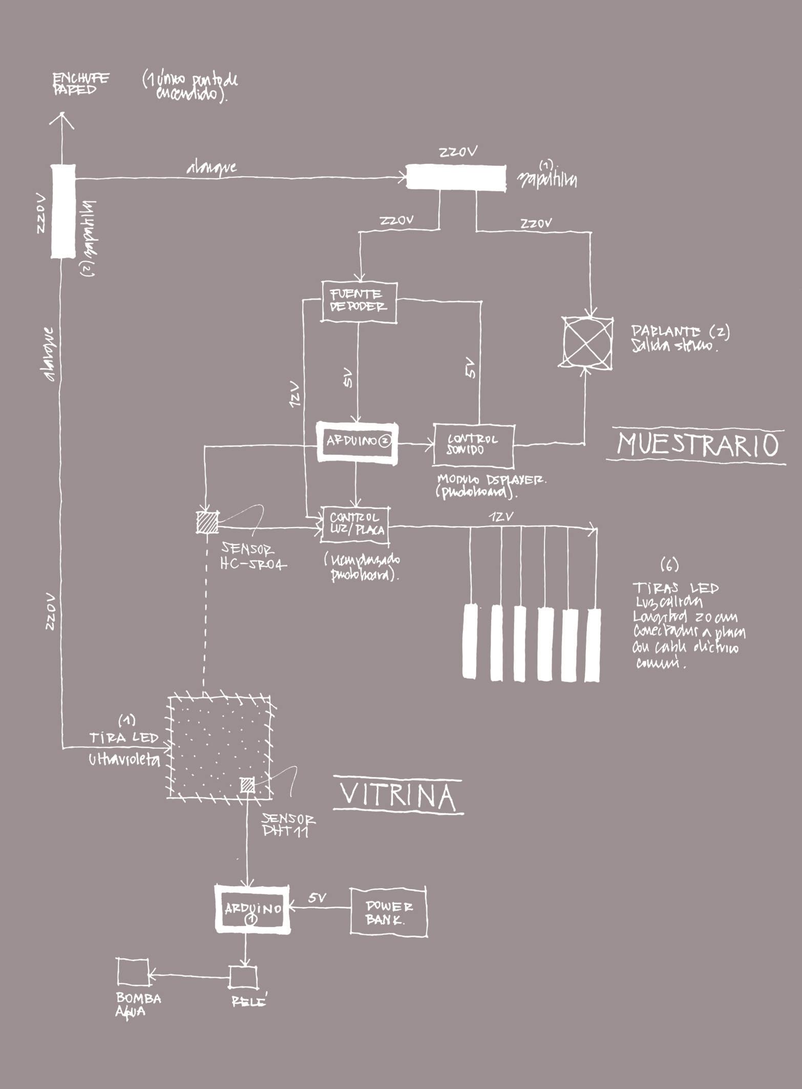 Tomas eléctricas (220V): 1 para la tira LED ultravioleta (vitrina). 2 para los parlantes y la fuente de poder (muestrario). Iluminación de sala: No requiere. Equipamiento externo a la obra: Vitrina: batería externa para alimentar Arduino. Muestrario: parlantes y fuente de poder con salidas de 5V y 12V.