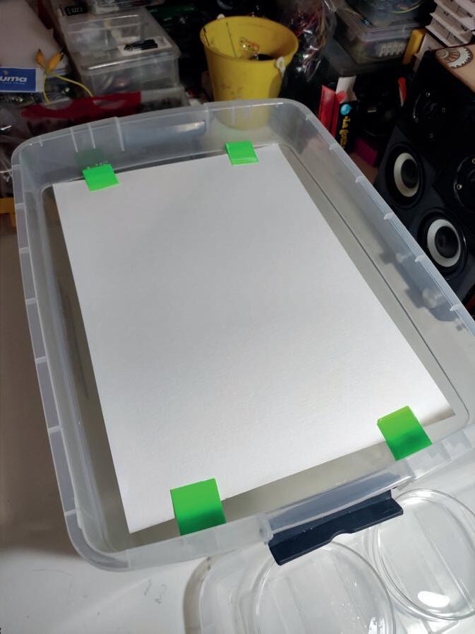 Se realizaron dos pruebas previas. La primera consistió en pequeñas muestras de papel frotagge en placas Petri, a las que se adicionó hongo Trichoderma obtenido de frutas en descomposición. La segunda prueba aplicó una emulsión ligera de agar sobre el papel, espolvoreando restos de material extraído de las fachadas. La primera prueba arrojó un buen crecimiento microbiano y fue utilizada como base para el cultivo final, mientras que la segunda no mostró desarrollo visible de microorganismos.