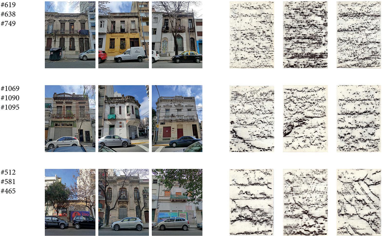 Extracto del ejercicio Volverse Ruina, donde se realizaron frottages con carbonilla sobre papel en 16 fachadas de la calle Catamarca. Los microorganismos recopilados de siete de estas fachadas conformaron la bioinstalación.
