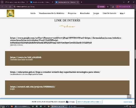 Esta página web tiene todas las secciones como: Inicio, Fundamentos de la robótica, Proyectos, Resultados, Juegos, Links Informativos, Galería y contactos.