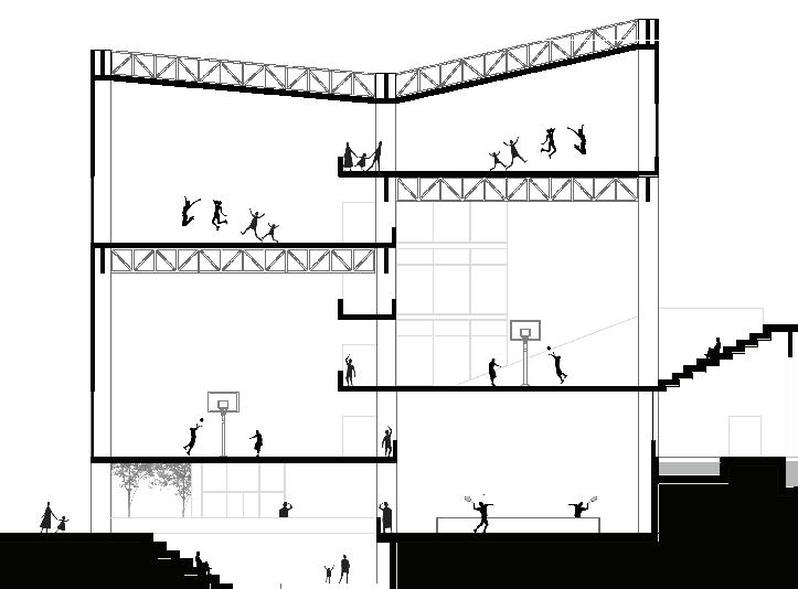 A su vez, se implementan elementos programáticos como una zona de trampolines, y un flyspot, o indoor skydiving como elementos de ocio lúdico, que complementan en programa deportivo del centro. Además, al no competir con los lugares de entretenimiento actuales sino proponer una opción distinta logra atraer a un público más extenso a la zona. Finalmente, el proyecto resulta en una oportunidad de vincular a personas de distintas edades en un espacio lúdico y sano creando un ambiente nuevo y beneficioso para la comunidad.
