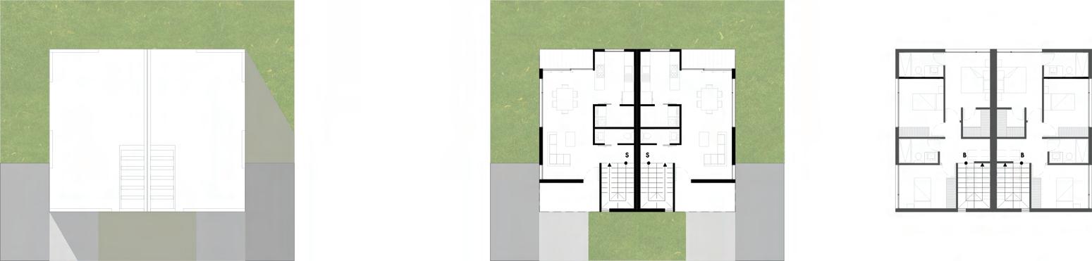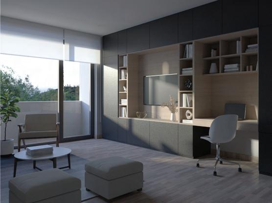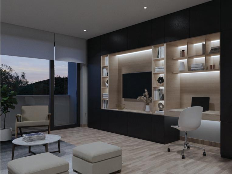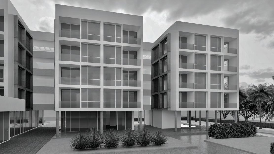 La vivienda multifamiliar se compone de 3 tipos distintos de departamentos: 60, 90 y 120 m2 respectivamente. Estos se ubican en 2 edificios que *comparten una plataforma la cual posee el equipamiento comunal en planta baja y una cubierta verde con área de piscina en la primera planta, como zona clave para la interacción social de los residentes. La propuesta se desarrolla en 5 niveles, donde el nivel de planta baja se destina a uso comercial y de zonas comunales como cafetería, gimnasio y sala comunal; y los otros 4 niveles están conformados por las unidades de vivienda, conectadas por un corredor central naturalmente ventilado que cuenta con vegetación e iluminación cenital. Los bloques están orientados estratégicamente para que las fachadas con las zonas sociales de las viviendas reciban una gran cantidad de luz a lo largo del día, con la protección y sombra necesaria para generar confort térmico y lumínico al interior de las viviendas.