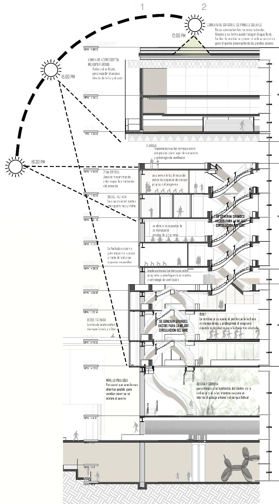 From the understanding of the orientation and sunlight, different facades are proposed according to the direction of the light, so the western facade is more controlled than the south facade, where the sun does not hit directly.