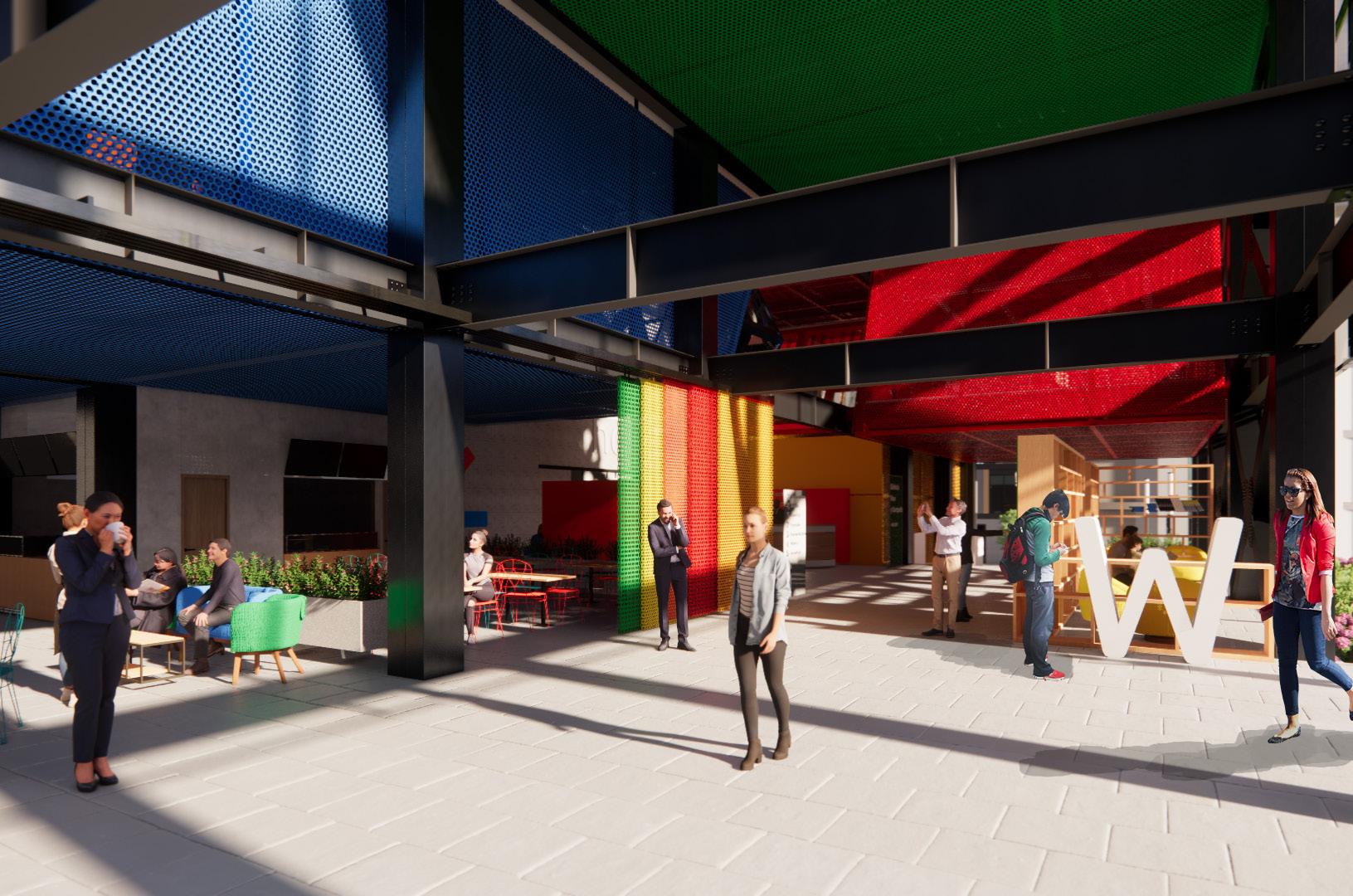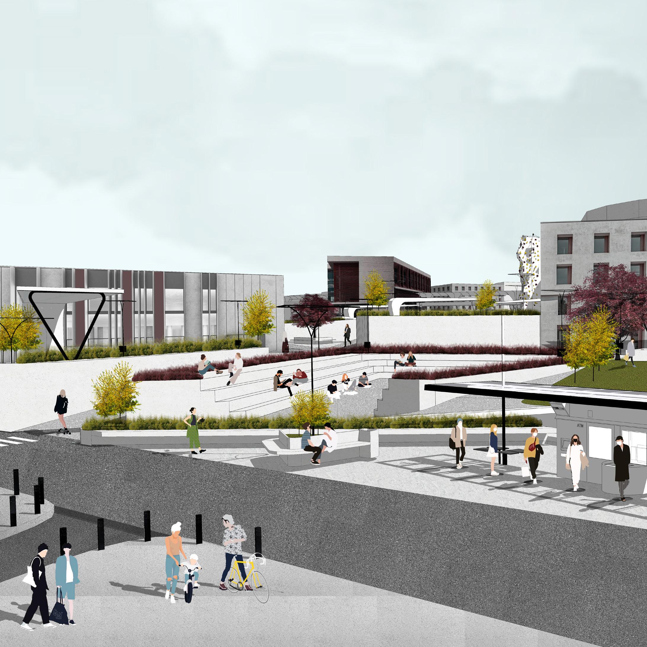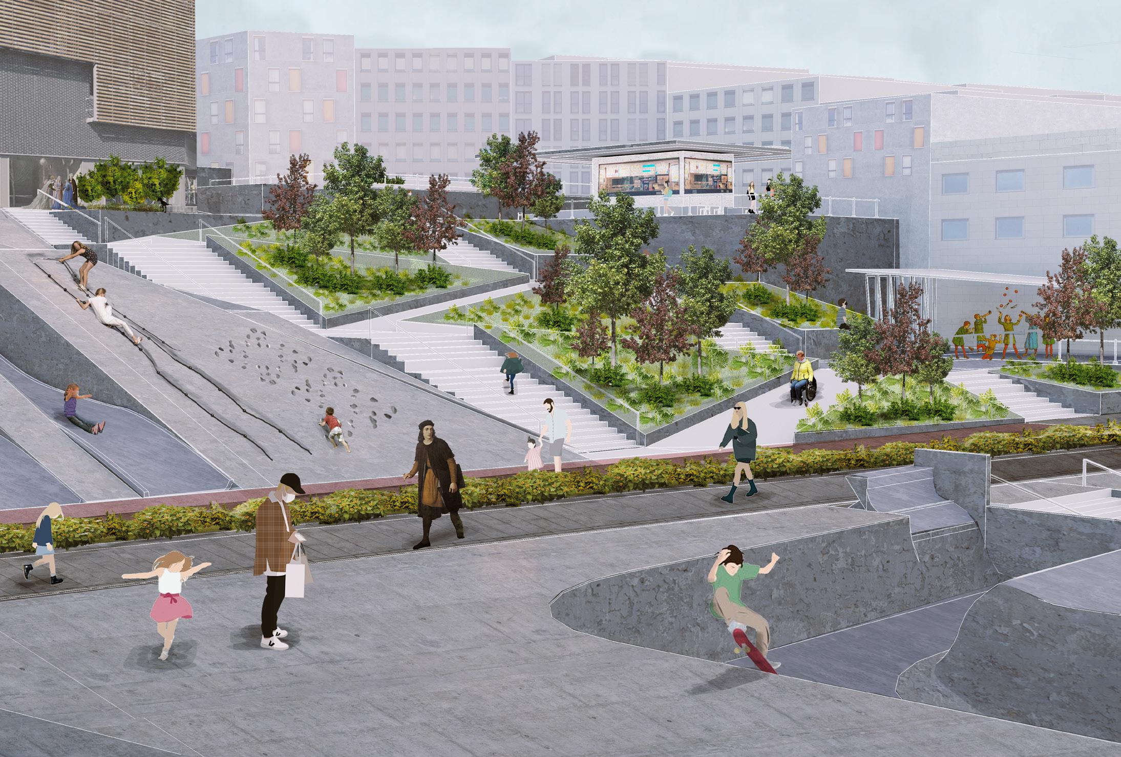 Se mantiene una circulación directa en planta baja con un zócalo que recorre el espacio público y lo conecta